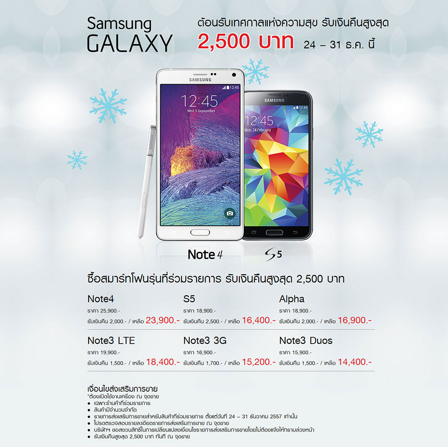 Samsung Galaxy ต้อนรับเทศกาลแห่งความสุข รับเงินคืนสูงสุด 2500 บาท (24-31 ธ.ค. นี้)