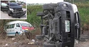 สาว 19 มือใหม่หัดขับ ตกใจรถตู้ปาดหน้า ชน 2 คัน บาดเจ็บ 7 ราย