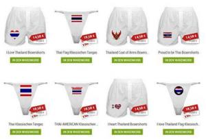 พบเว็บไซต์ของสหรัฐอเมริกา www.cafepress.com ซึ่ง เป็นเว็บไซต์ขายสินค้าประเภทชุดชั้นในบุรุษและสตรี ปรากฏว่ามีการขายกางเกงลายธงชาติไทย ตราครุฑ และแผนที่ประเทศไทย