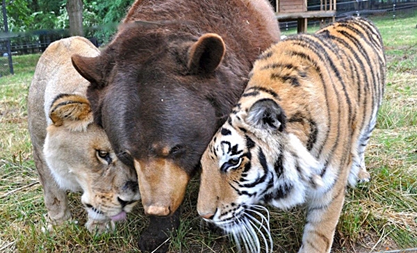นี่คือภาพน่าประหลาดใจของสัตว์ป่าที่ขึ้นชื่อในเรื่องความดุร้าย แต่พวกมันกลับอยู่ร่วมกันได้อย่างสงบสุขจนน่าแปลกใจในบ้านพักสัตว์ป่าในรัฐจอร์เจีย โดยสิงโตมีชื่อว่า Leo ส่วนเสือมีชื่อว่า Shere Khan และหมีมีชื่อว่า Baloo