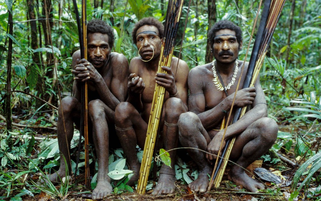 Korowai กับหอกและธนู ที่ใช้เป็นอาวุธ