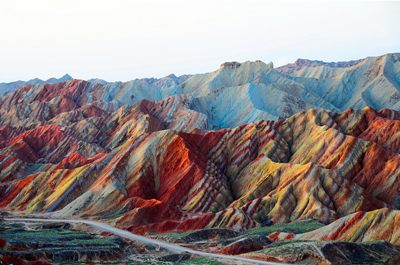 เทือกเขาแห่งนี้ มีชื่อว่า “เขาสายรุ้งตันเซี๋ย” (Danxia Landform) เป็นแนวเขาที่มีลวดลายเป็นริ้วสีธรรมชาติ ประกอบไปด้วยหินทรายและแร่ธาติต่างๆ ที่เกิดขึ้นจากการเคลื่อนตัวของเปลือกโลกเมื่อ 24 ล้านปีก่อน ลม และ ฝนใช้เวลานานนับพันๆปี กัดเซาะแนวเขาจนเกิดเป็นภูมิประเทศที่กว้างใหญ่ไพศาลและมีสีสันสุดแสนจะมหัศจรรย์ดั่งเช่นทุกวันนี้