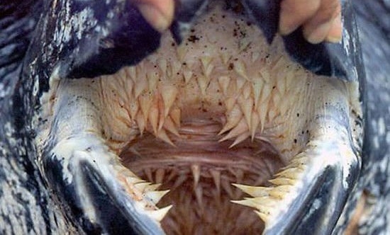 สาเหตุที่เต่ามะเฟืองมีช่องปากน่ากลัวคล้ายหนามแบบนี้...? นั่นเป็นเพราะเต่ามะเฟืองมักจะกินเหยื่อที่มีร่างกายอ่อนนุ่มมากเป็นอาหารอย่างเช่น "แมงกะพรุน" ดังนั้นหนามในปากของมันจึงเป็นอวัยวะที่ช่วยให้มันสามารถกินได้อย่างรวดเร็ว