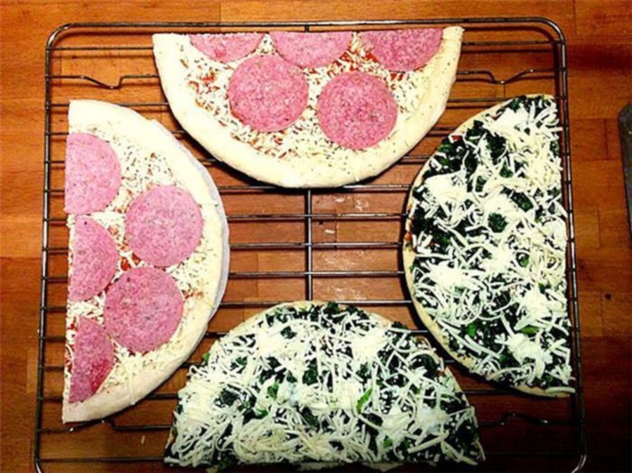 1. อบพิซซ่าสองอันในครั้งเดียว แค่เเบ่งครึ่งพิซซ่าแต่ละชิ้นแล้ววางเรียงตามภาพ