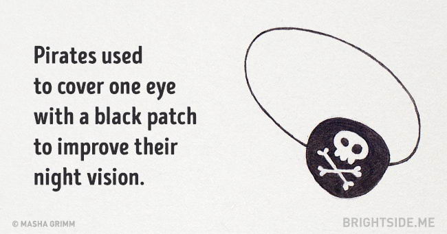 7. โจรสลัดปิดตาตัวเองข้างหนึ่งด้วยที่ปิดตาสีดำ เพื่อทำให้มองเห็นตอนกลางคืนได้ดีขึ้น