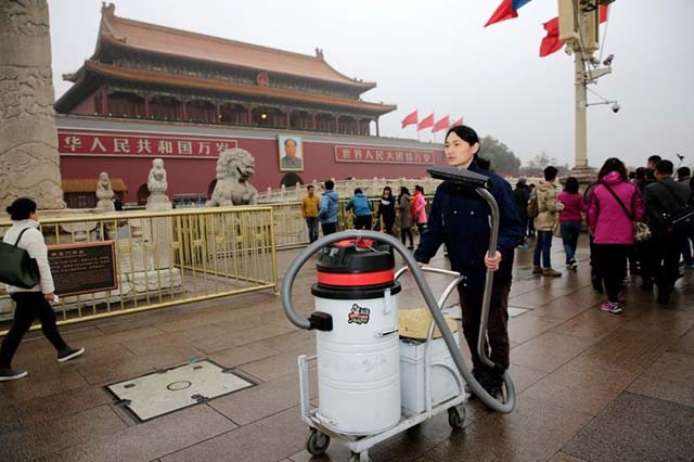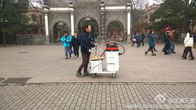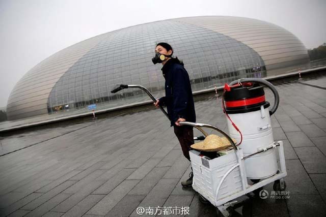 ศิลปินชาวจีนใช้ชื่อว่า Brother Nut (坚果兄弟) ใช้เวลากว่า 100 วันเดินไปรอบกรุงปักกิ่งพร้อมกับเครื่องดูดฝุ่นเคลื่อนที่ เขาใช้เวลา 4 ชั่วโมงต่อวันในการไล่ดูดฝุ่นควันที่ลอยอยู่ในอากาศของใจกลางเมืองกรุงปักกิ่ง เพื่อนำมาทำ “ก้อนอิฐ”