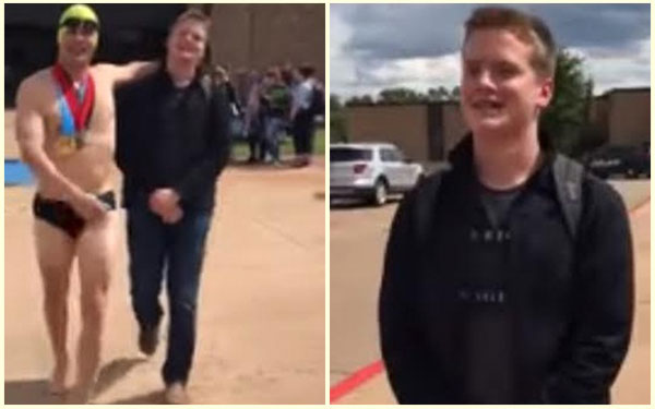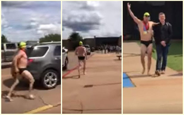 Most EPIC school pickup ever - Stillwater, OK dad picks up son from school while wearing Speedo