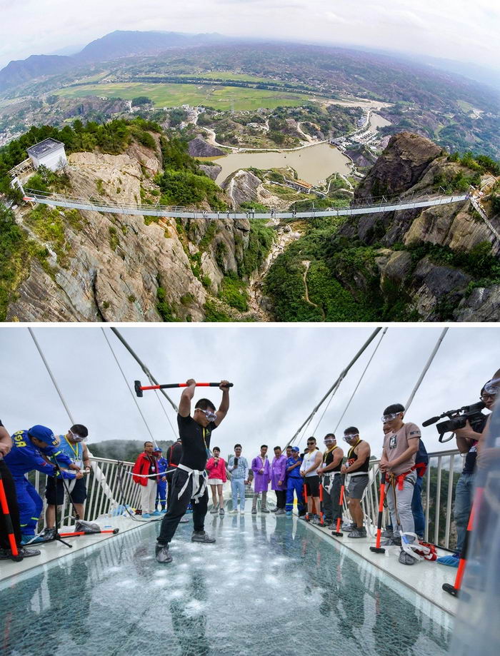 สะพานแก้วที่ใหญ่ที่สุดตั้งอยู่ในอุทยานจางเจียเจี้ย มณฑลหูหนาน โดยมีความยาวถึง 1,410 ฟุต กว้าง 20 ฟุต และมีความสูงเหนือหุบเขากว่า 1,000 ฟุต โดยในระหว่างการก่อสร้าง ได้มีการโชว์ความแข็งแรงของสะพานแห่งนี้ด้วยการใช้ค้อนหนัก 11 ปอนด์ทุบโชว์ รวมถึงการนั่งบนรถที่มีน้ำหนักมากอีกด้วย