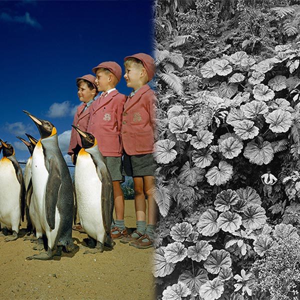 ภาพกลุ่มเด็กชายในชุดนักเรียนถ่ายคู่กับนกเพนกวิ้นในสวนสัตว์ลอนดอน ถ่ายเมื่อปี 1953 โดย B. ANTHONY STEWART และ DAVID S.