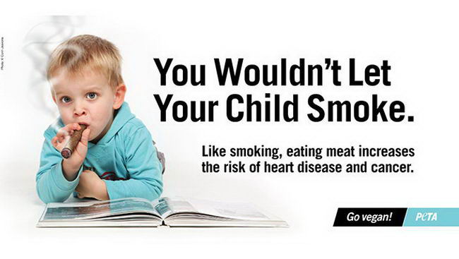 อย่างภาพโฆษณาด้านบนคือการบอกว่า คุณคงไม่อยากให้ลูกสูบบุหรี่ เพราะสูบบุหรี่ก็เหมือนกินเนื้อ ที่เพิ่มโอกาสเสี่ยงต่อโรคหัวใจและมะเร็ง
