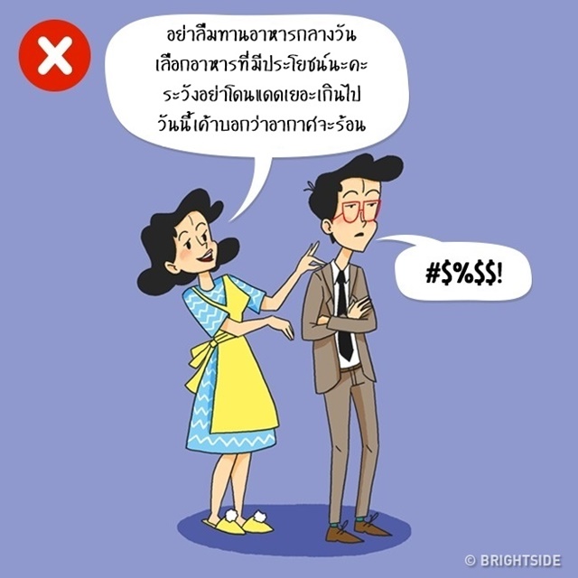 การพูดทุกอย่างที่คิดออกมาไม่ใช่เรื่องดีเลยสำหรับความสัมพันธ์ แต่ควรจะมีศิลปะในการพูด เช่น ถ้าคิดว่าคนรักของเรานั้นอ้วนเกินไป ก็ควรชวนไปออกกำลังกายด้วยกัน ไม่ใช่แค่พูดว่า “คุณอ้วนเกินไปแล้วนะ”