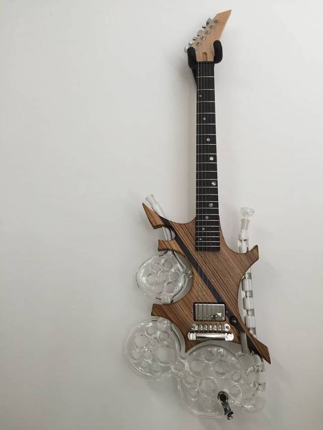 จากนั้นก็พาไปชมบ้องแปลกๆ ที่สร้างมาจากการเป่าแก้ว อย่างเช่นภาพนี้เป็นบ้องกีต้าร์ จะโซโล่ไปด้วย ดูดกัญชาไปด้วยก็ยังได้