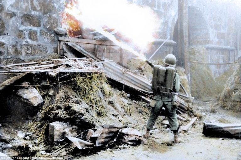 ทหารสหรัฐฯใช้เครื่องพ่นไฟ M2 พ่นไปยังฐานทัพของญี่ปุ่นที่เมืองมะนิลา ในช่วงใกล้จบสงครามในปี 1945