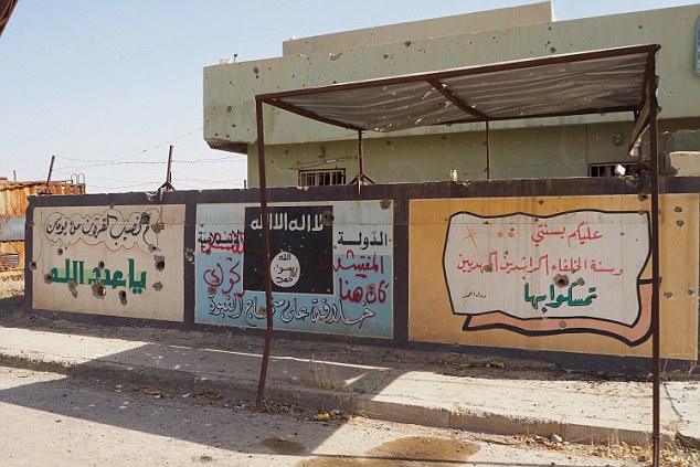 แม้แต่บริเวณป้ายรถเมล์ก็ยังมีสัญลักษณ์ของกลุ่ม ISIS ติดอยู่