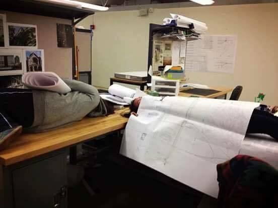 สำหรับเด็กเด็กสถาปัตย์แล้ว ไม่ว่าจะเป็นตอนเรียนหรือเข้าสู่ช่วงเวลาทำงาน ก็มักที่จะต้องทุ่มเทเวลาสำหรับการปั่นงานอยู่ตลอดเวลา จึงไม่แปลกที่จะมีภาพหลุดๆของความเหนื่อยและความเพลียของพวกเขาปล่อยออกมาสู่สายตาชาวโลกเหมือนอย่างภาพเหล่านี้ ลองไปดูกัน