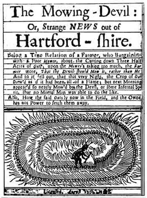 ชาวนามีการพูดถึงวงกลมประหลาดในท้องทุ่งมานานหลายศตวรรษเริ่มตั้งแต่ศตวรรษที่ 15 เป็นต้นมา ในปี 1678 มีจุลสารข่าวเล่าเรื่องชาวนาที่เมืองฮาร์ตฟอร์ดเชียร์ ประเทศอังกฤษ ผู้ซึ่งไม่ยอมจ้างคนงานตัดต้นพืชในทุ่งของเขา แล้วคืนหนึ่งเกิดไฟไหม้ทุ่งของเขาแต่พอรุ่งเช้ากลับพบว่าท้องทุ่งถูกตัดอย่างเรียบร้อยชนิดที่ใครจะทำแบบนั้นได้ จนถูกเรียกเป็นพวกปีศาจ “The Mowing-Devil” และนี่เป็นบันทึกครั้งแรกเกี่ยวกับ Crop Circles อย่างไรก็ตามนักวิจัยบางคนไม่ถือว่ากรณีนี้เป็น Crop Circles เพราะลำต้นพืชถูกตัดไม่ใช่โค้งงอล้มลง