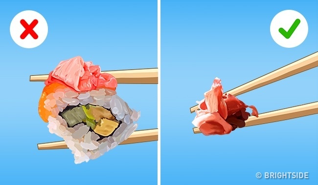บางคนเอาขิงมาวางบนซูชิ แต่ความจริงแล้ว ควรกินของในระหว่างกินอาหารจานนึงหมดแล้วจะไปต่ออีกจานนึง ขิงช่วยทำให้ช่องปากสดชื่นและช่วยทำให้รสชาติของอาหารที่กินไปก่อนหน้าอร่อยขึ้น