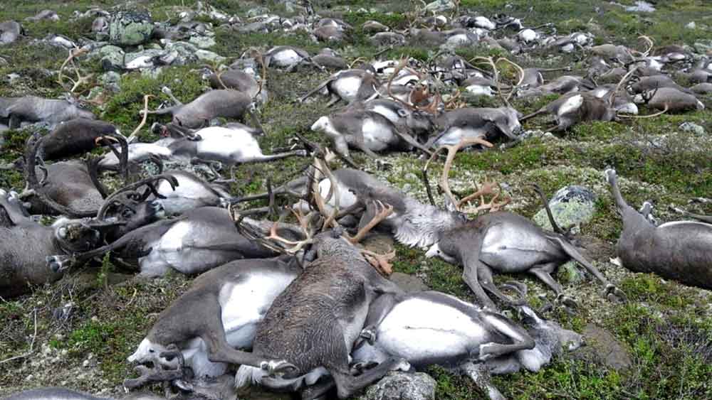 เมื่อวันที่ 2 กันยายน 2016 บนภูเขา Hardangervidda ประเทศนอร์เวย์ ได้พบกวางจำนวน 323 ตัวนอนตายกองเกลื่อนไปทั่วไหล่เขา ภายหลังจากการเกิดพายุฝนฟ้าคะนองอย่างหนัก การสังหารหมู่ตามธรรมชาติที่เจ้าหน้าที่นอร์เวย์เรียกว่าเป็นฟ้าผ่าที่มีการตายมากที่สุดในประวัติศาสตร์ของประเทศ