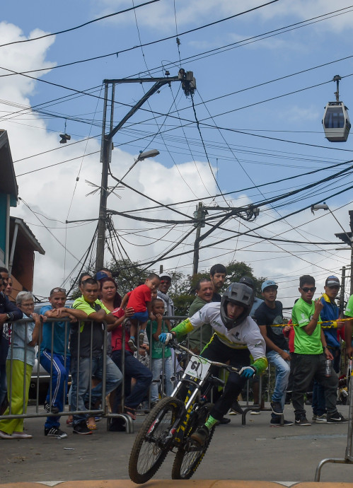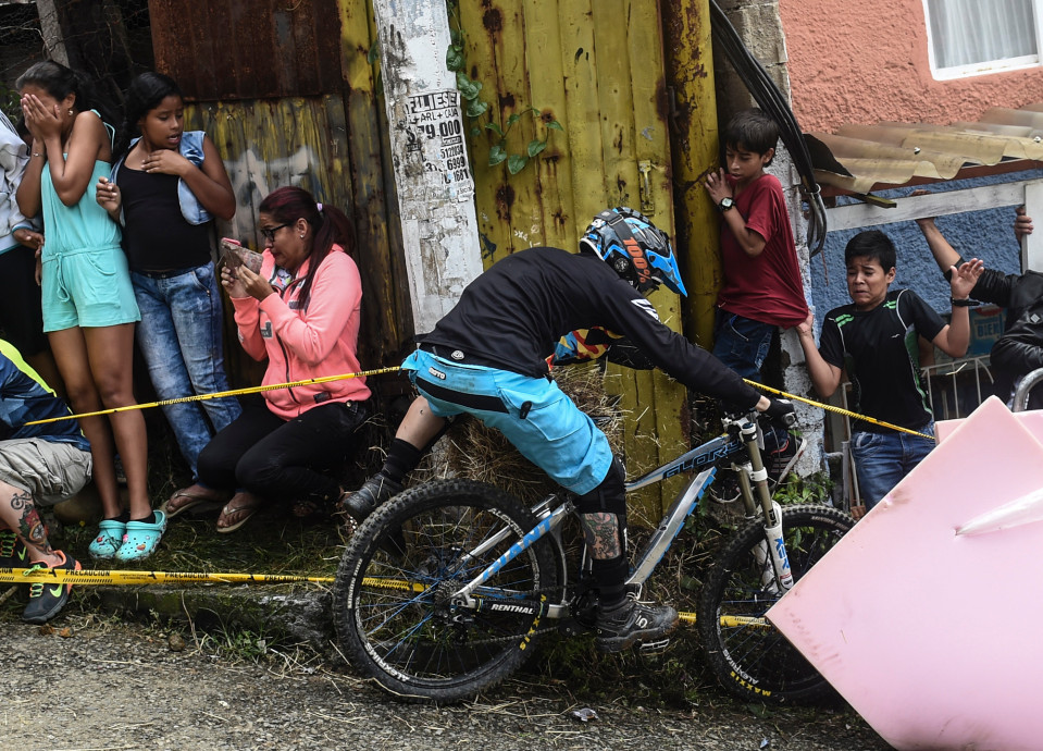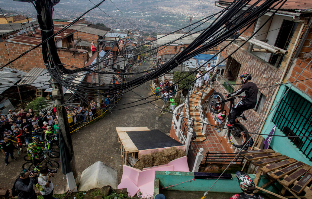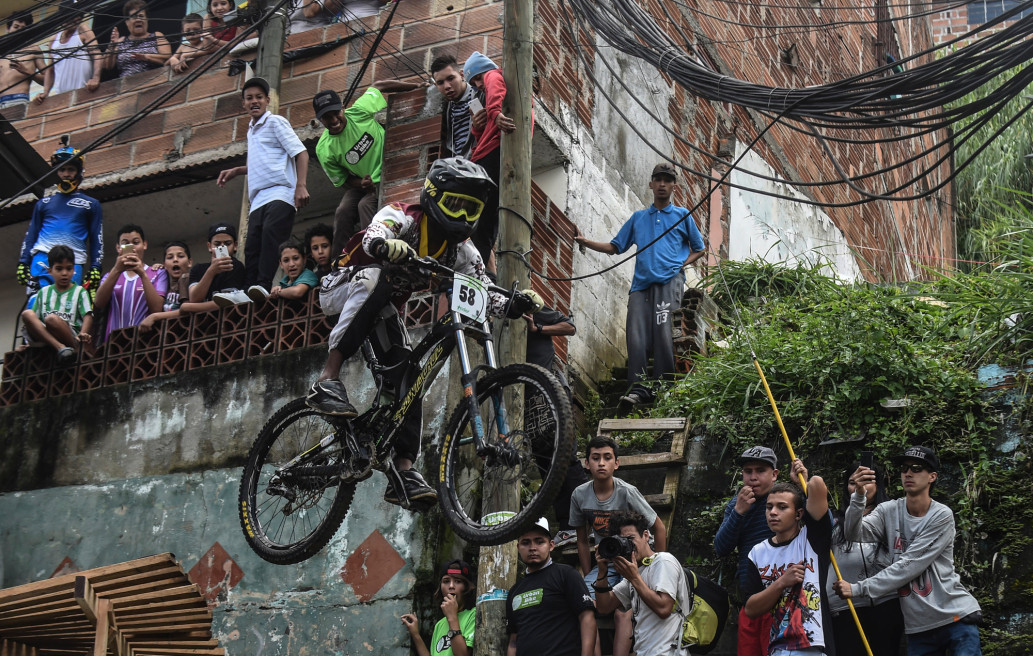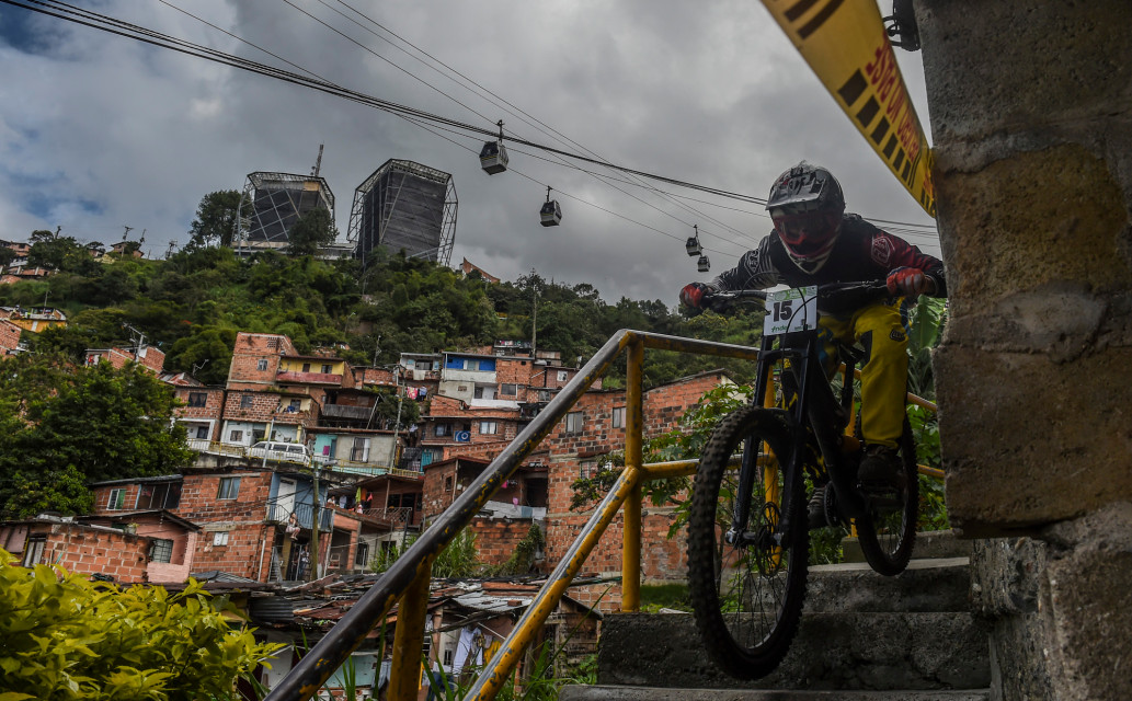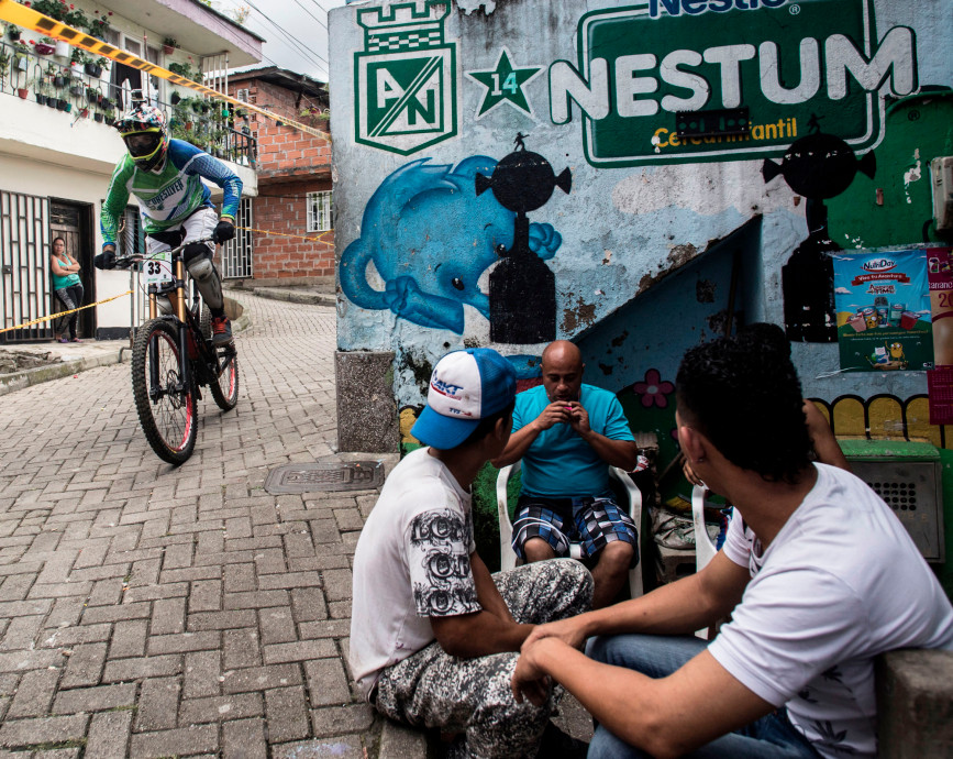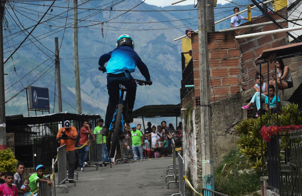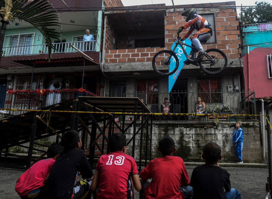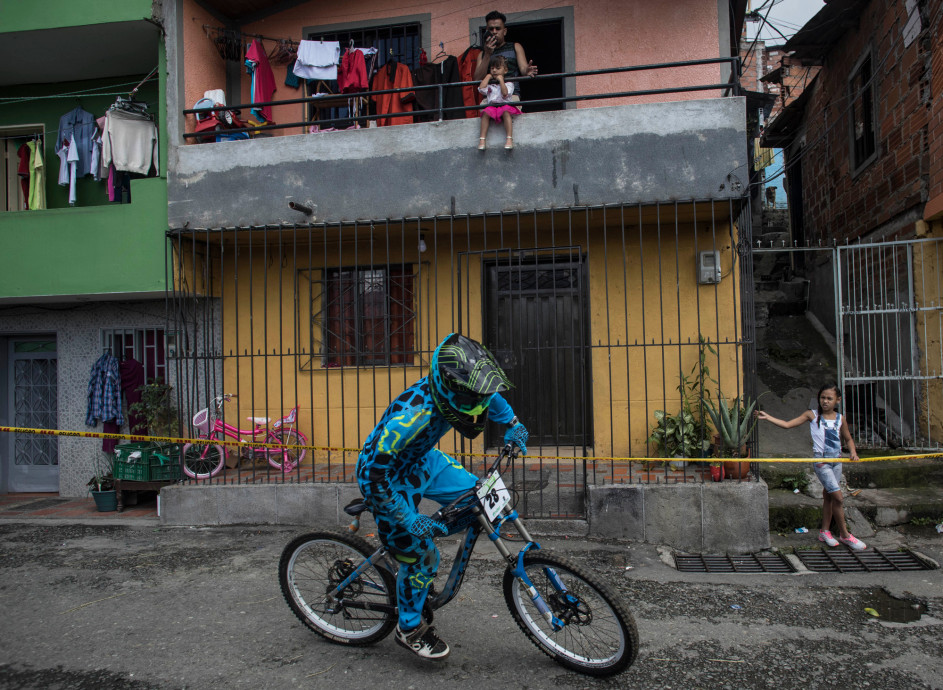 ภาพถ่ายการแข่งขันขี่จักรยานเสือภูเขาของโคลัมเบียเป็น การแข่งขันรอบสุดท้ายที่ Comuna 1 shantytown ใน Medellin แผนก Antioquia, Colombia