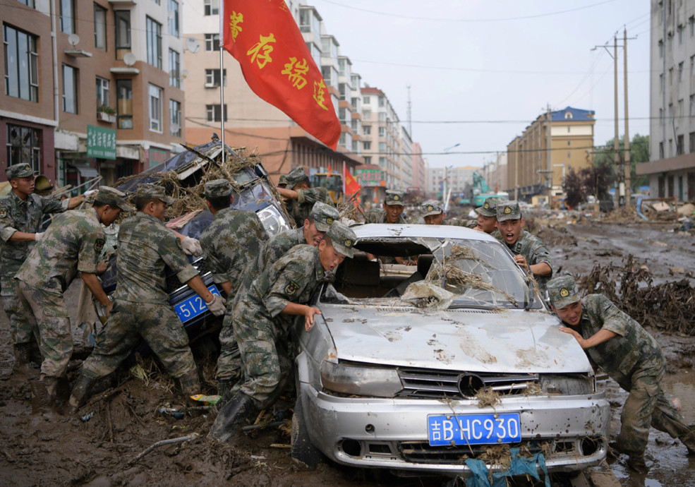 เจ้าหน้าที่กู้ภัยลากรถที่ชำรุดออกจากเศษและโคลนหลังจากน้ำท่วมในเมืองยงจีจังหวัดจี๋หลินประเทศจีนในเดือนกรกฎาคม
