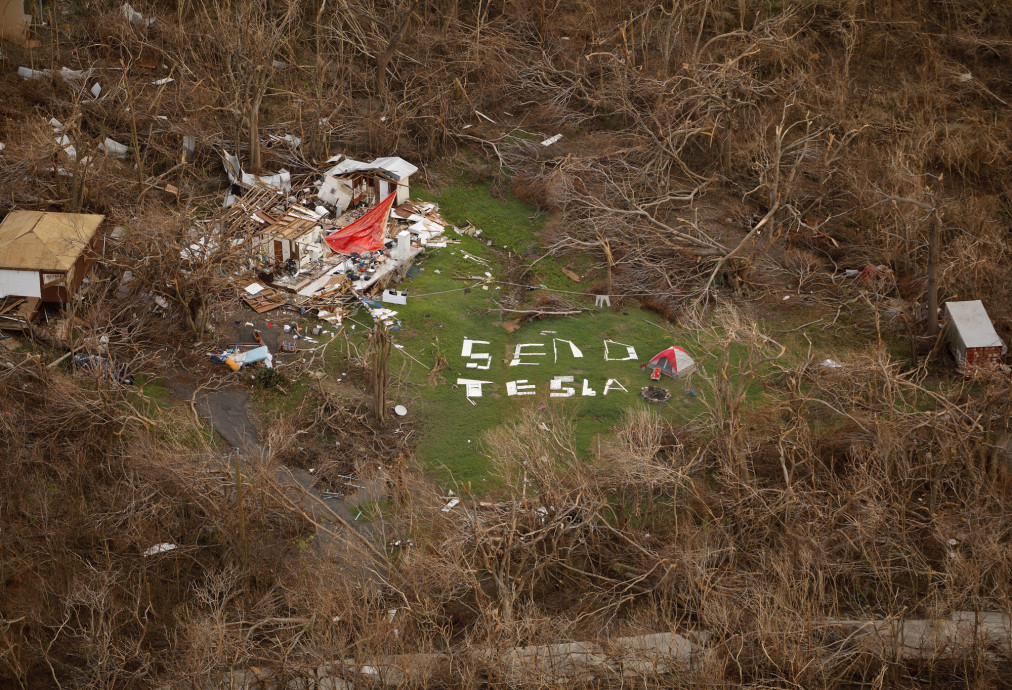 ป้ายบอกว่า "ส่ง Tesla" ถูกสะกดออกมาพร้อมกับเศษสตางค์ที่ใกล้เคียงโดยที่พายุเฮอริเคน Irma ทางเหนือของเซนต์จอห์น