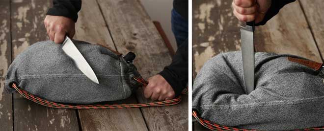 นอกจากจะใช้มีดกรีดไม้เข้าแล้ว กระเป๋าใบนี้ยังมีคุณสมบัติกันน้ำในตัว และแน่นอนมันกันขโมยได้ (กันขโมยเอาสิ่งของในกระเป๋าออกมา) เพราะมันมาพร้อมกับกุญแจทองเหลืองสุดทนทานที่แถมมาให้พร้อมสายรัดที่ทำจากใยเหล็กสังเคราะห์สุดทนทานอีกด้วย “หากคุณลืมลูกกุญแจ หายนะจะมาเยือนเจ้าของกระเป๋าในทันที ฮ่าๆ “