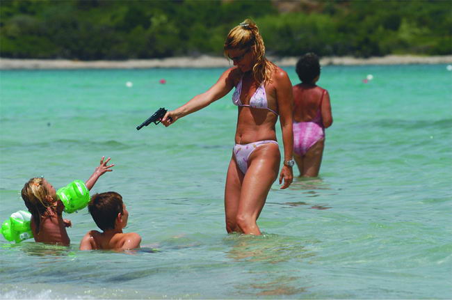 15. แพทริเซีย เปลเยกริโน กำลังเล่นปืนฉีดน้ำกับลูกๆ ของเธอบนชายหาดมารินา