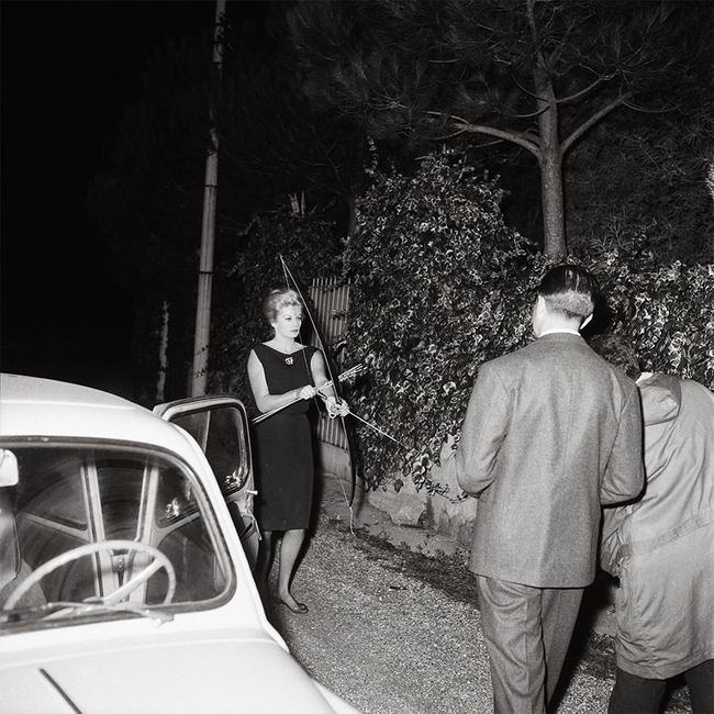 2. อนิต้า เอ็คเบิร์ก เผชิญหน้ากับปาปารัสซี่ โดยในมือของเธอถือธนูและลูกศรเอาไว้ขู่พวกเขา ภาพนี้ถูกถ่ายขึ้นในปี 1960