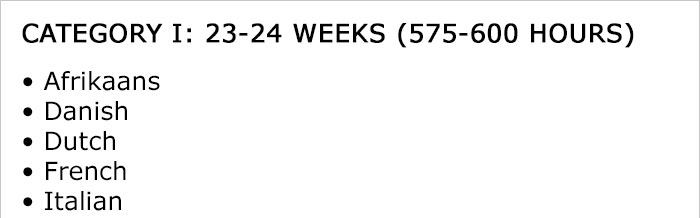 44 สัปดาห์สำหรับภาษาเหล่านี้ สังเกตว่าส่วนใหญ่จะเป็นภาษาจากทางยุโรปตะวันออก และเอเชีย
