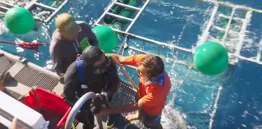 ในตอนนั้นก็ได้มีนักประดาน้ำคนหนึ่งที่อยู่ในกรงพอดี เขาพยายามตั้งสติแล้วหนีไปที่ก้นของกรง สุดท้ายฉลามขาวก็ดิ้นจนหลุดจากกรงในที่สุด การอยู่ก้นกรง จะทำให้ฉลามโจมตีได้ยาก เพราะฉลามเป็นสัตว์ที่พุ่งขึ้นโจมตีจากด้านล่าง
