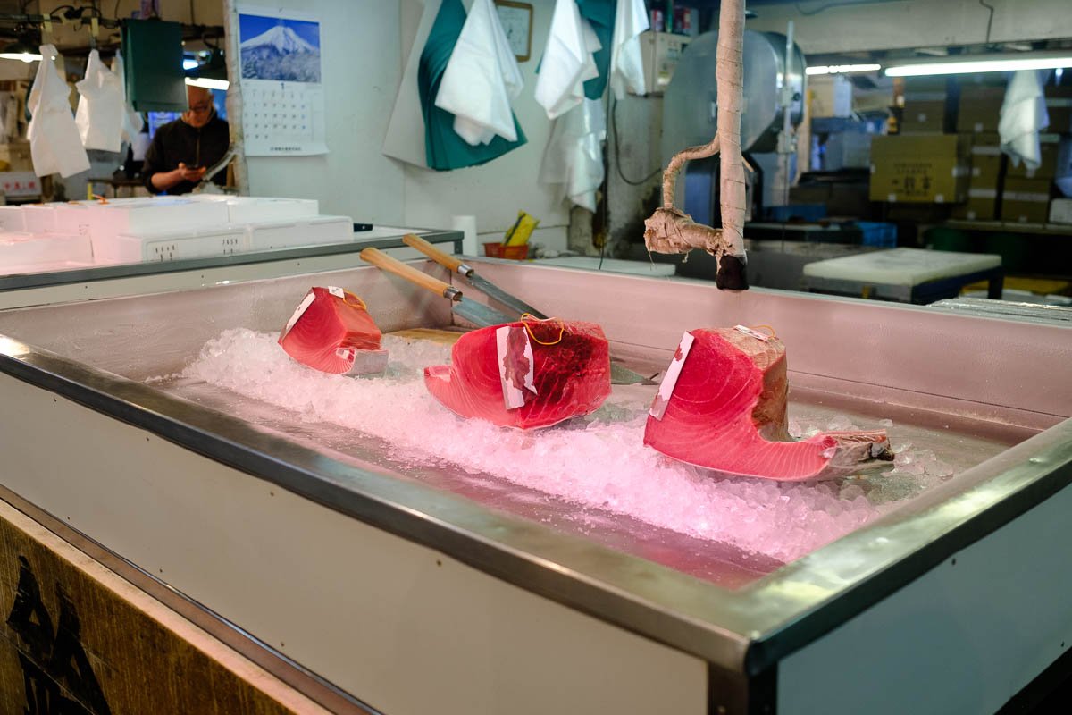 พ่อค้าปลาก็จะมาเลือกซื้อชิ้นเนื้อปลาทูน่าที่วางขายอยู่ บางคนถึงกับนวดและพูดคุยกับมันขณะที่มันกำลังถูกแล่ด้วยล่ะ (โอ้โห…)