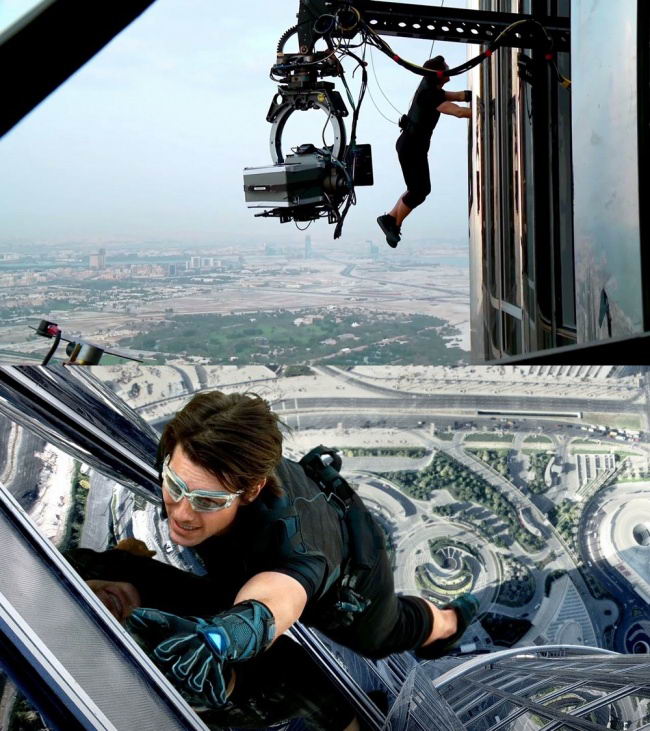 คุณคิดว่าการถ่ายทำฉากแอ็คชั่นบนตึกที่สูงที่สุดในโลก ผู้กำกับจะใช้ CGI หรือไม่ ? แน่นอนว่าหลายๆ คนคิดว่าต้องใช้ แต่จริงๆ แล้วฉากนี้ เฮียทอมของเรายอมเสี่ยงตายลงทุนถ่ายฉากนี้ด้วยตัวเองที่ระดับความสูง 1,700 ฟุต