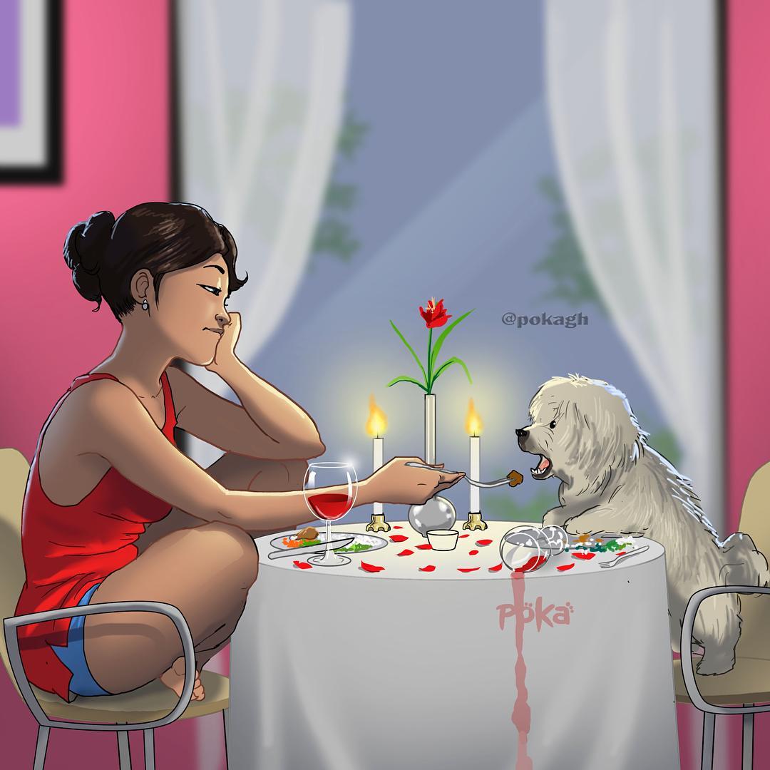เมื่อนักวาดภาพชาวกานา Poka ตัดสินใจที่จะอธิบายเป้าหมายอย่างใดอย่างหนึ่งก็มั่นใจได้ว่าความคิดเห็นจะเป็นภาพประกอบทั้งหมด ภาพประกอบง่ายๆพบว่าผู้ชายที่เล่นวิดีโอเกมกับผู้หญิงบนโซฟาที่อยู่ข้างหลังเขาในโทรศัพท์ของเธอ บิดคือขาของผู้หญิงที่อยู่บนหัวของคนที่แต่งตัวประหลาดเช่นอุจจาระพักผ่อน Poka โพสต์รูปภาพด้วยคำอธิบายภาพแบบง่ายๆ 'Goals' ภาพที่มีหุ้นนับพัน ๆ คนมีจำนวนมากที่ชาวกานูเอียแบ่งปันความรู้สึกมากเกินไป