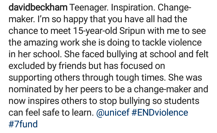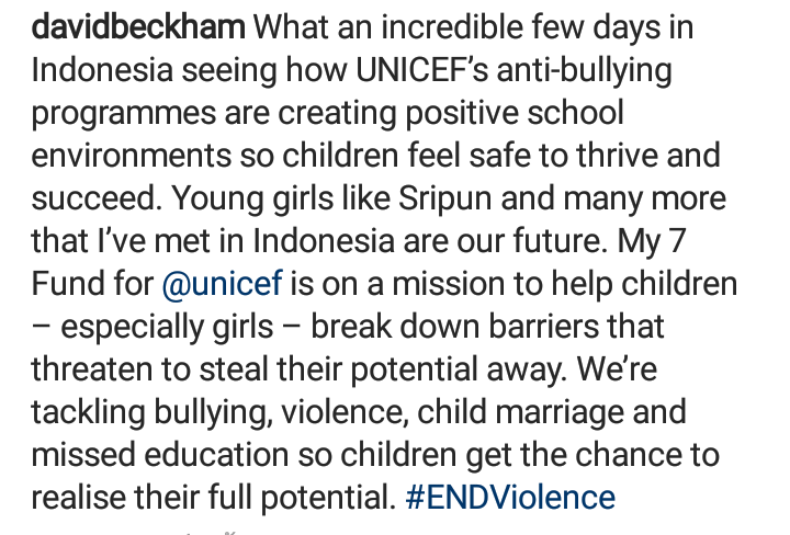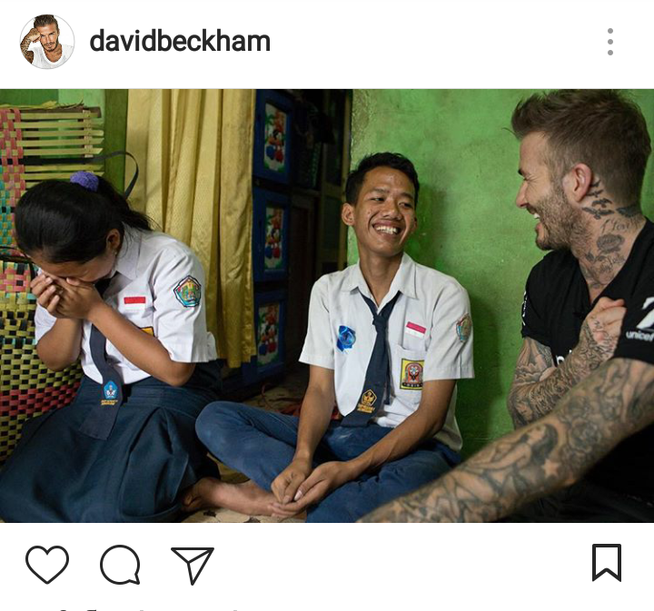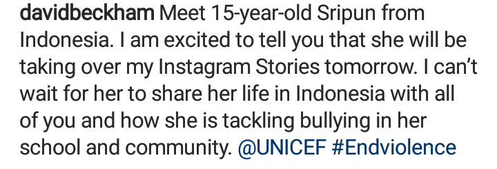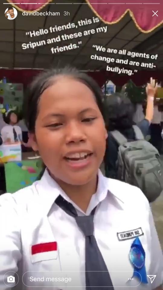 เมื่อวันที่ 27 มีนาคม 2018 David Beckham นักฟุตบอลชื่อดังระดับโลกได้ทำการโพสต์รูปภาพและเรื่องราวของการเดินทางของเขาบนอินสตาแกรม แต่การเดินทางในครั้งนี้ไม่ได้เป็นการไปเที่ยวพักผ่อนหย่อนใจ แต่ทว่ามันคือการเดินทางเพื่อไปช่วยเหลือเด็กหญิงคนหนึ่งที่กำลังประสบปัญหาการถูกกลั่นแกล้งในโรงเรียน โดยที่ Beckham ได้เดินทางไปยังประเทศอินโดนีเซียเพื่อไปหานักเรียนหญิงวัย 15 ปีที่ชื่อว่า Sripun