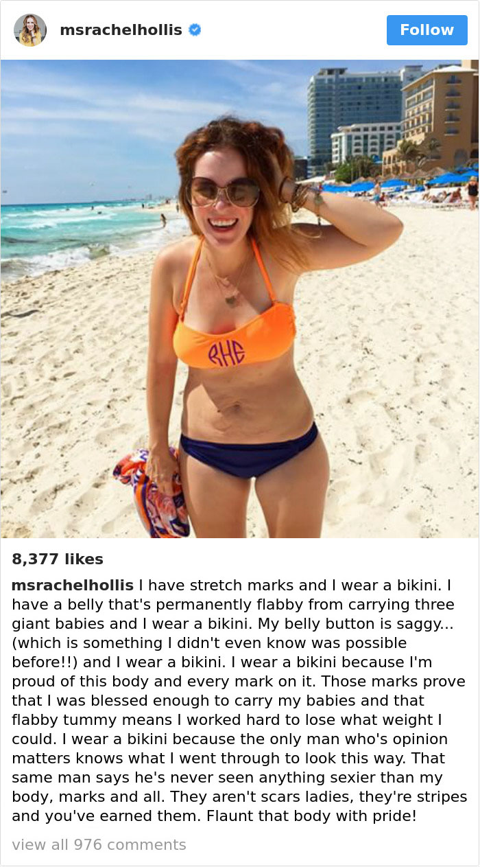 แต่ก็มีสาวๆ ที่ไม่สนใจในเรื่องพวกนี้แต่พวกเธอก็มีความมั่นใจในการใส่บิกินีเดินเล่นชายหาดเช่นกัน จากการเริ่มแคมเปญของChelsea Duarte ที่ให้สาวๆ ร่วมแชร์รูปภาพที่พวกเธอได้ใส่ชุดบิกินีในแบบที่พวกเธอเป็น และ มีความสุขกับมันโดยไม่สนว่าคนอื่นจะมองพวกเธอยังไง แต่ต้องขอปรบมือให้กับความกล้าของพวกเธอเหล่านี้จริงๆ