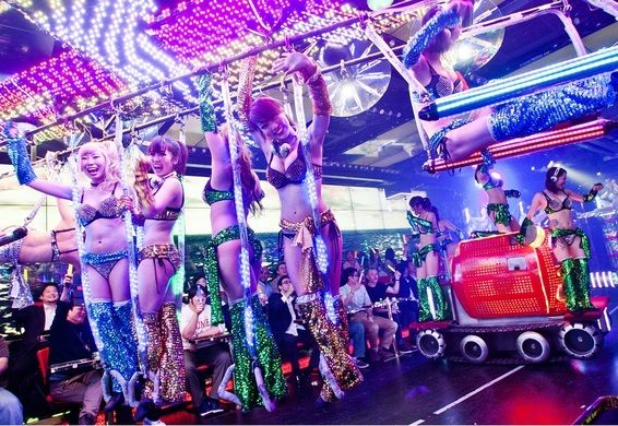 ชุดวับๆ แวมๆ กับแสงไฟกระพริบๆ เลเซอร์สาดส่องไปทั่วทำให้ร้านอาหารนี้แตกต่างจากร้านอื่นๆ ไม่เหมือนใคร หุ่นยนต์ผู้หญิงมี่มาพร้อมกับหน้าอกมหึมา หุ่นยนต์ Gundam มาคอยเต้นให้ลูกค้าดู หุ่นจำลองตัวละครดังๆ ที่เหมือนจะถอดออกมากจากจอทีวีเลยทีเดียว แต่ไม่ใช่ว่าจมีแต่หุ่นยนต์นะ คนจริงๆ ก็มี จะเป็นนักเต้นในชุดบิกินี่ออกมาโชว์ลวดลายบนบาร์ให้ลูกค้าได้ดื่มด่ำบรรยากาศแก้อาการเลี่ยนหุ่นยนต์ได้ดีทีเดียว