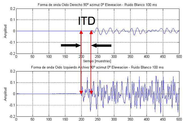 ตัวอย่างของ ITD ในกรณีนี้จะสังเกตได้ว่าหูซ้าย (ภาพบน) จะได้ยินเสียงช้ากว่าหูขวา (ภาพล่าง) เล็กน้อย