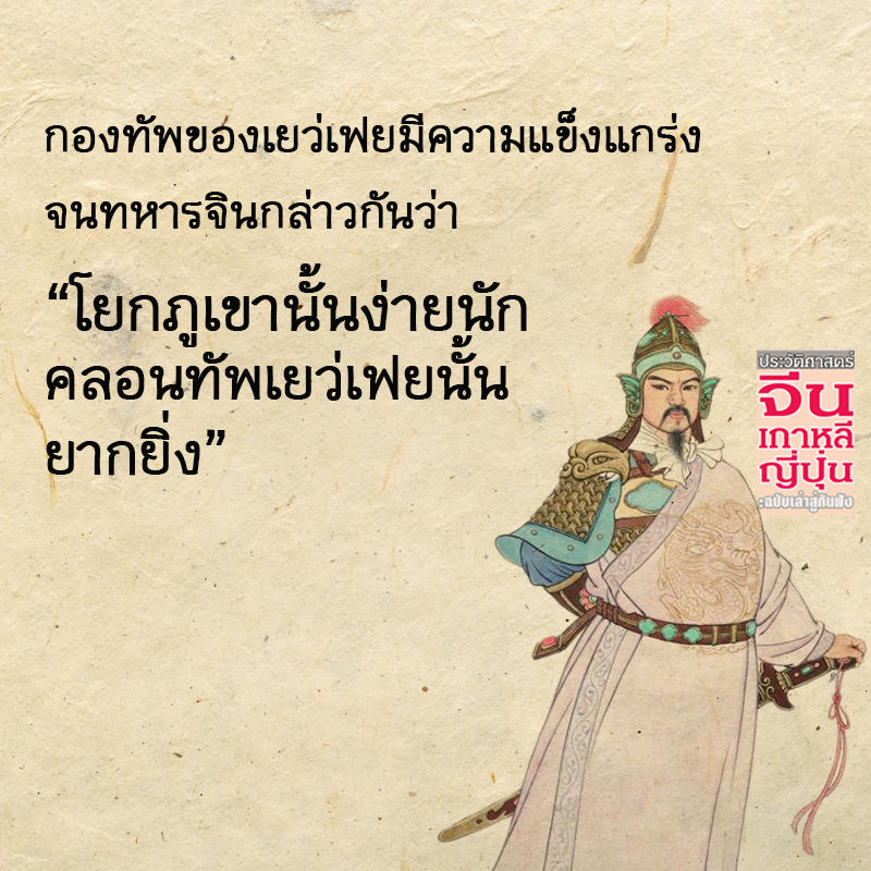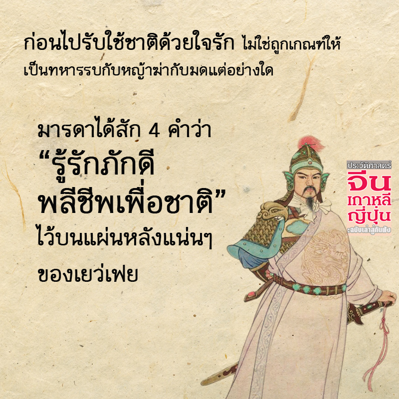 เยว่เฟย ขุนศึกผู้มีความรักชาติรักแผ่นดินเป็นที่ตั้ง ทำศึกสงครามเพื่อกู้ชาติอันอ่อนแอเหมือนเป็ดเป็นโรคให้รอดพ้นจากการรุกรานของอาณาจักรจิน ซื่อสัตย์ภักดี จนได้รับการยกย่องให้เป็นเทพด้านความซื่อสัตย์