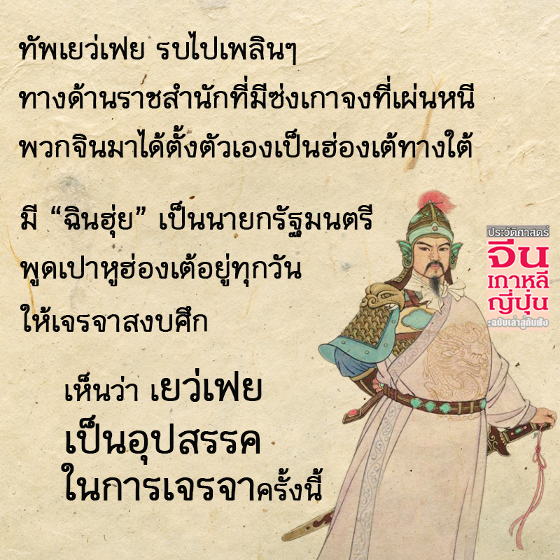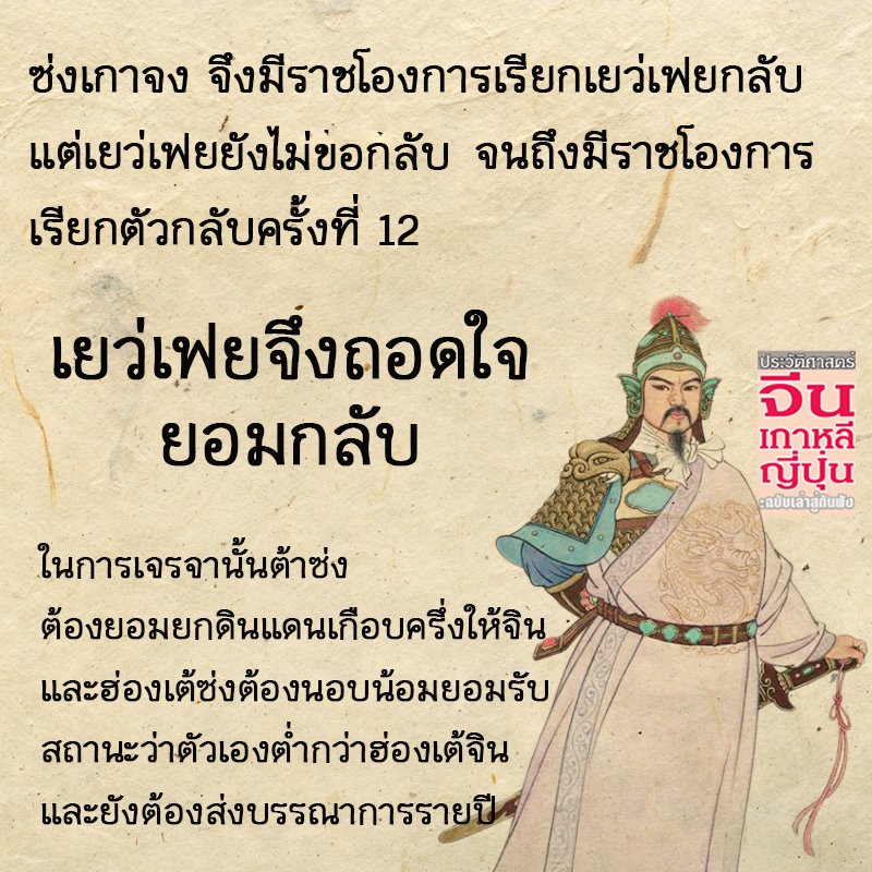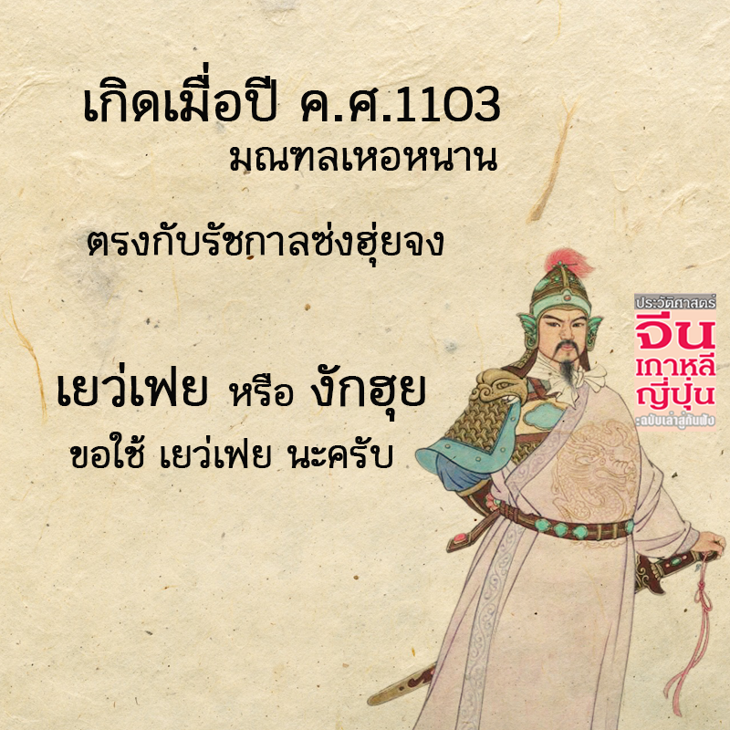 กระผมขอเล่าช่วงเวลาการเปลี่ยนแปลงช่วงราชวงศ์ซ่งเหนือเป็นราชวงศ์ซ่งใต้ ให้ท่านทราบสักเล็กน้อย ซ่งฮุ่ยจง รัชกาลที่ 8 แห่งซ่งเหนือ ที่เรียกซ่งเหนือเพราะมีเมืองหลวงที่ เปี้ยนเหลียง หรือไคเฟิงในปัจจุบัน ซ่งฮุ่ยจงไม่อยากฝากชื่อเป็นฮ่องเต้องค์สุดท้าย รักตัวกลัวตาย จึงยกราชบัลลังก์ให้ลูกเป็นซ่งชินจง ท่านเห็นมั้ย กลัวตายแค่ไหนฮ่องเต้องค์นี้ โยนเผือกร้อนให้ลูก ไม่มีความเป็นนักต่อสู้แม้แต่น้อย แต่ก็ไม่รอดทั้ง 2 พ่อลูกถูกกองทัพจินจับตัวไปเป็นเชลย อับอายขายขี้หน้า