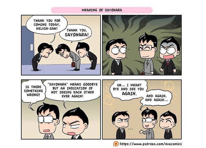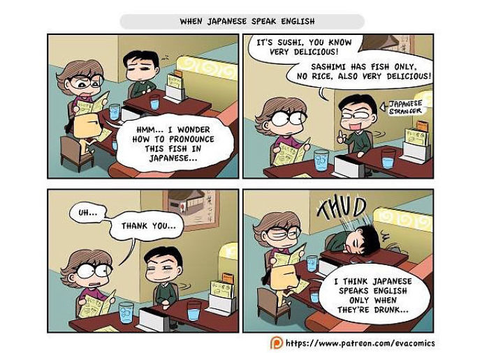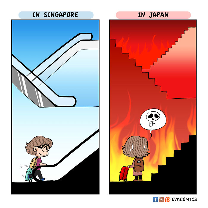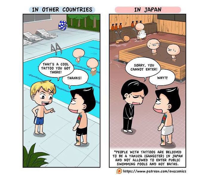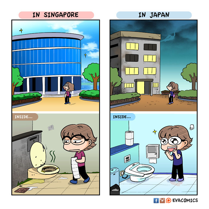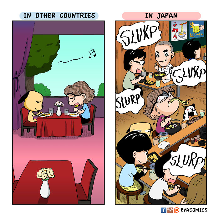 นศต่างชาติคนหนึ่งที่ได้ศึกษาในมหาลัยในกรุงโตเกืยวในช่วงปี 2010 ถึง 2014 ได้สังเกตุเห็นความแตกต่างทางวัฒนธรรมมากมาย ระหว่าง ญี่ปุ่น และ ประเทศของเขา และ เขาได้วาดการ์ตูนเปรืยบเทืยบวัฒนธรรมของ ญี่ปุ่น และ ประเทศของเขา ครับ.