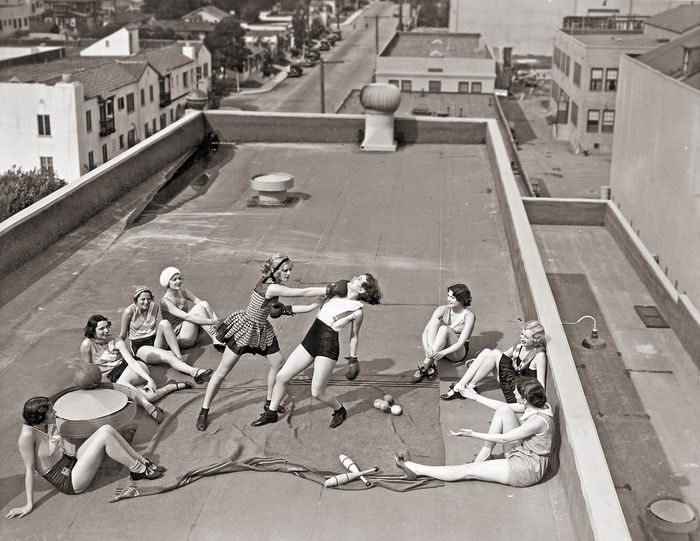 7.หญิงสาวที่กำลังเล่นชกมวยกันอยู่บนดาดฟ้าตึกในลอสแองเจลิส ในช่วงทศวรรษที่ 1930