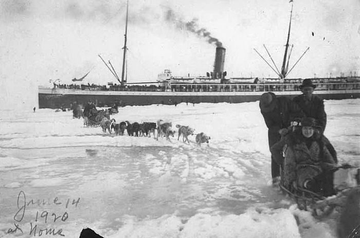 6. เนื่องจากเรือไม่สามารถเล่นผ่านแผ่นน้ำแข็งที่หนามาได้ ผู้โดยสารจึงต้องลงจากเรือขึ้นมาบนแผ่นน้ำแข็ง เพื่อขึ้นสู่ชายฝั่งในอลาสก้า ปี 1920