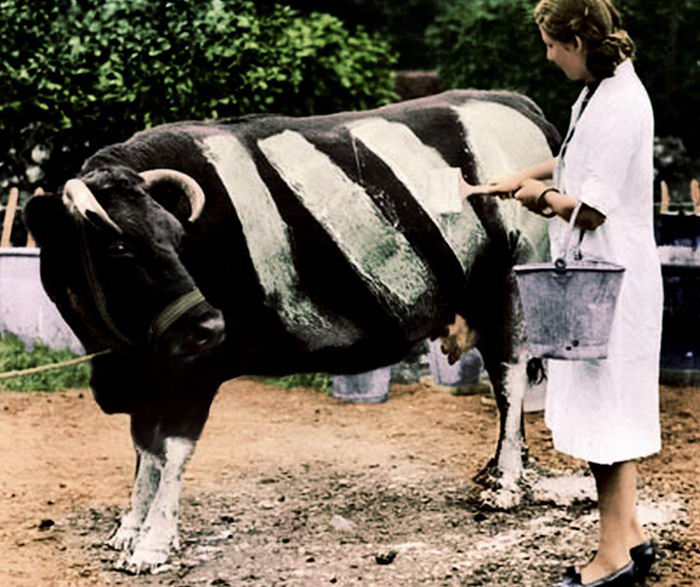 5.หญิงสาวกำลังทาสีขาวลงบนตัววัวเพื่อให้มองเห็นได้ชัดเจนขึ้น จากเหตุการณ์ไฟฟ้าดับครั้งใหญ่ในอังกฤษ เมื่อปี 1941