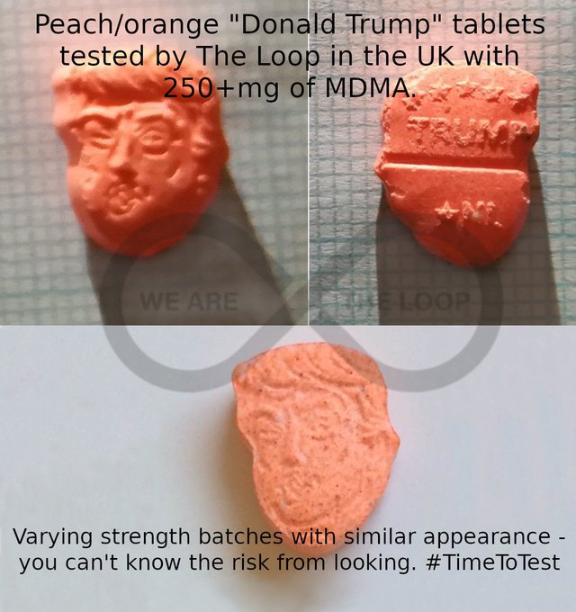 Donald Trump ประธานาธิบดีของสหรัฐอเมริกาคนปัจจุบัน ถือว่าเป็นอีกหนึ่งคนที่มักถูกชาวเน็ตนำไปทำเป็นมีมหรือนำล้อเลียนในรูปแบบต่างๆ ไม่ว่าจะเป็นรูปปั้นที่มีป้ายให้ฉี่ใส่หรือมาสคอตที่กำลังนั่งส้วมอยู่ก็ตาม แต่ล่าสุดนี้รูปของ Donald Trump ได้ถูกยกระดับไปอีกขั้นเสียแล้ว เมื่อพบว่ามีผู้ค้ายาเสพติดรายหนึ่ง ผลิต “ยาอี” ออกมาโดยออกแบบให้คล้ายกับใบหน้าของ Donald Trump…