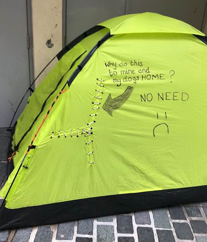 1. เต็นท์ของคนไร้บ้านที่ถูกทำลาย จนคนไร้บ้านต้องเขียนเอาไว้ว่า “ทำไมถึงทำแบบนี้กับบ้านของผมและสุนัขของผม ?”