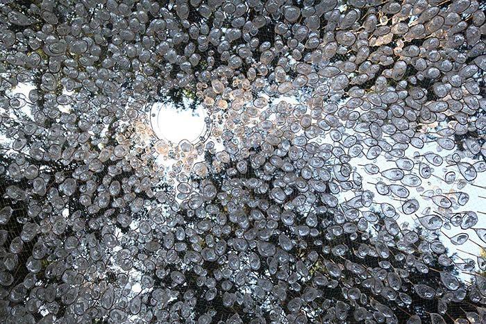 " อ่างเก็บน้ำ " ที่ดูเหมือนโคมระย้า ประกอบด้วย หยดแก้วโปร่งใส 5000 ชิ้น สามารถเก็บน้ำฝนได้ 360 ลิตร ในป่าสนที่อิตาลี