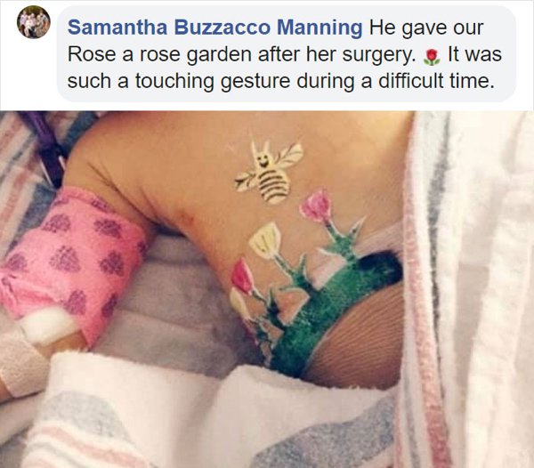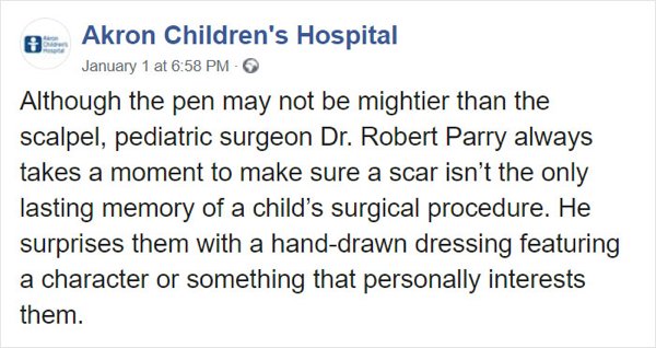ผุ้อำนวยการด้านการผ่าตัดกุมารเวชศาสตร์ที่โรงพยาบาลเด็ก Akron ดร.โรเบิร์ตเพอรี่ที่ได้ไปไกลกว่านี้เพื่อบรรเทาความกลัวของเด็ก หลังจากดร.เพอรี่วางมืดผ่าตัดลง เขาได้วาดรูปการ์ตูนแสนสนุก และ สีสันสดใสบนผ้าปิดแผลหลังเด็ก ของแต่ละคนเพื่อซ่อนรอยแผลเป็นของเด็ก.
