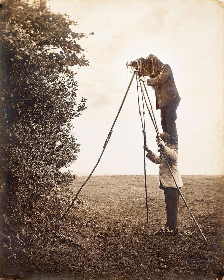 ช่างภาพสัตว์ป่าชาวอังกฤษยืนบนบ่าผุ้ช่วยของเขา เพื่อถ่ายรังนกพ.ศ 2433