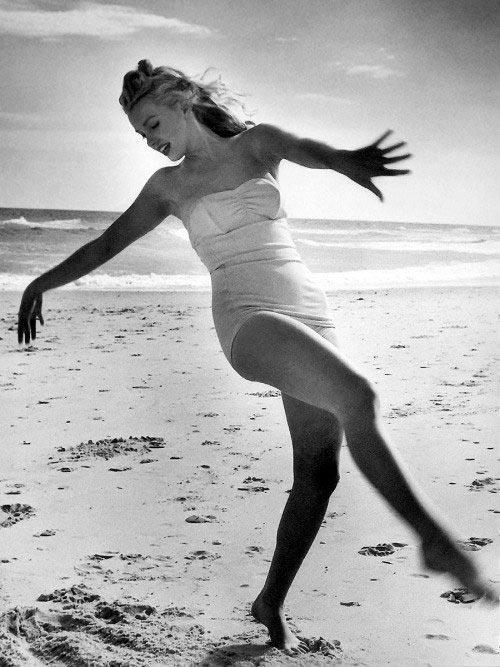 มารลิลีน มอนโร ในชุดคอสเพลส์ของเธอบนชายหาด ในปี 2492