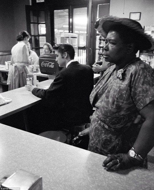 เอลวิส เพรสรี่ กำลังนั่งรอไข่กับเบคอน และ ผู้หญิงผิวสี ที่สั่งของเหมือนเอลวิส ไม่สามารถนั่งเก้าอี้ในร้านได้ ในรัฐเทนเนสซี่ ในปี 1956
